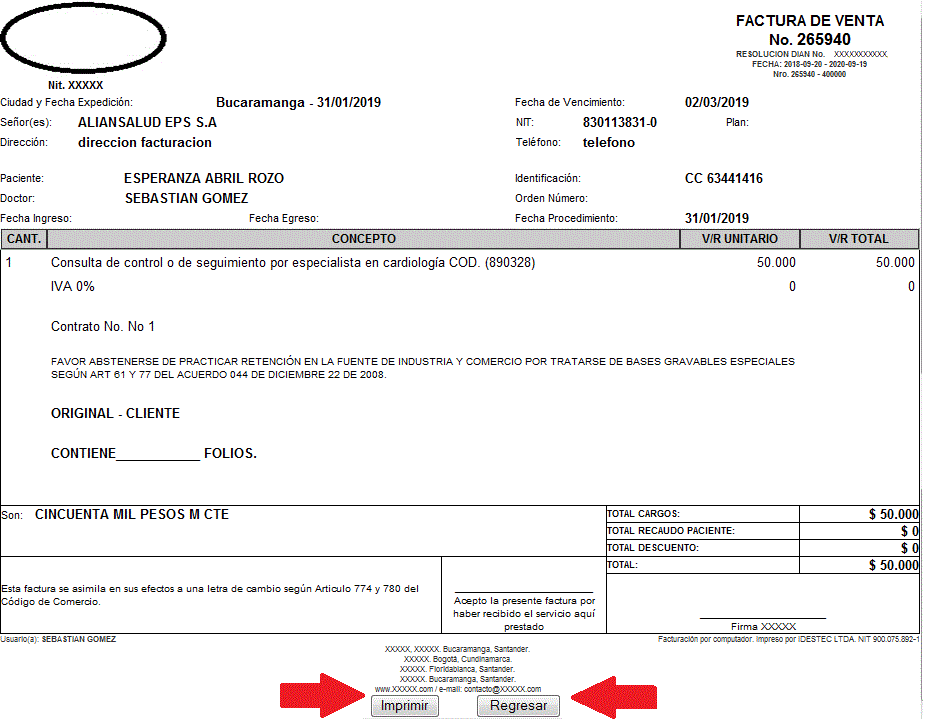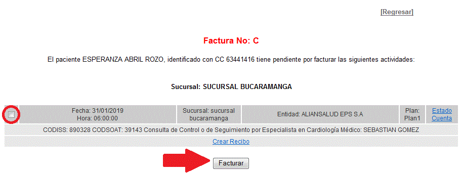 | 4. Luego se escoge lo que se desea facturar al paciente y se da click en Facturar: |