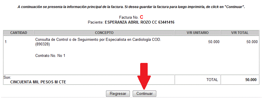 | 5. Finalmente vemos una vista previa de lo facturado, si esta bien, se da click en Continuar: |